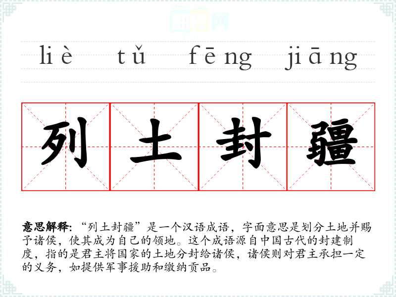“列土封疆”是一个汉语成语,字面意思是划分土地并赐予诸侯,使其成为自己的领地。这个成语源自**古代的封建制度,指的是君主将国家的土地分封给诸侯,诸侯则对君主承担一定的义务,如提供军事援助和缴纳贡品。
