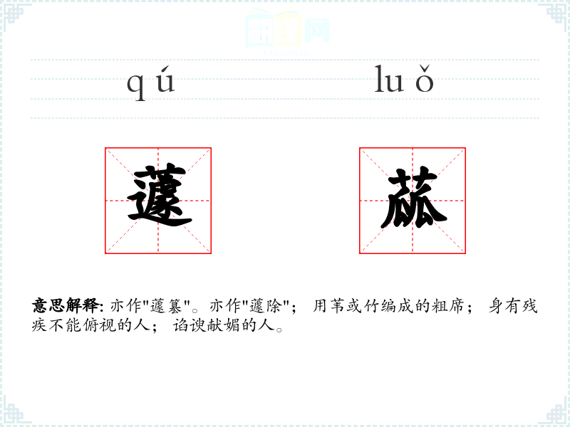 亦作"蘧簒"。亦作"蘧除"; 用苇或竹编成的粗席; 身有残疾不能俯视的人; 谄谀献媚的人。