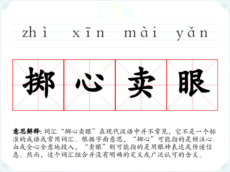 由于“掷心卖眼”不是一个标准词汇,我们无法给出一个确切的基本定义。它可能是某个特定语境下的临时组合,用以表达某种情感或行为的强烈程度。