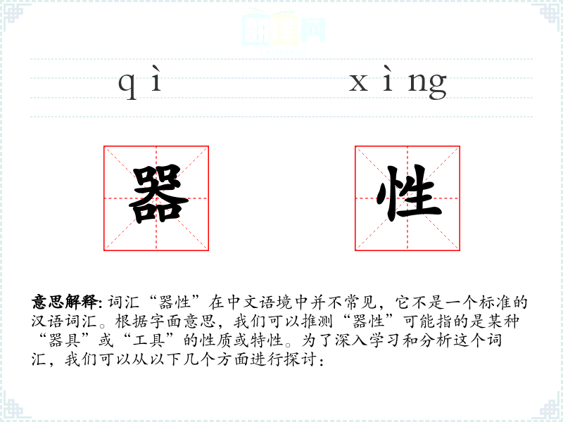 词汇“器性”在中文语境中并不常见,它不是一个标准的汉语词汇。根据字面意思,我们可以推测“器性”可能指的是某种“器具”或“工具”的性质或特性。为了深入学习和分析这个词汇,我们可以从以下几个方面进行探讨: