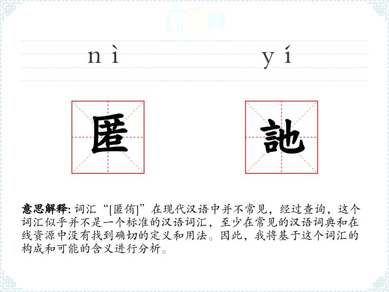 词汇“[匿侑]”在现代汉语中并不常见,经过查询,这个词汇似乎并不是一个标准的汉语词汇,至少在常见的汉语词典和在线资源中没有找到确切的定义和用法。因此,我将基于这个词汇的构成和可能的含义进行分析。