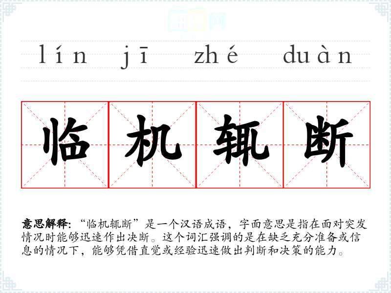 “临机辄断”是一个汉语成语,字面意思是指在面对突发情况时能够迅速作出决断。这个词汇强调的是在缺乏充分准备或信息的情况下,能够凭借直觉或经验迅速做出判断和决策的能力。
