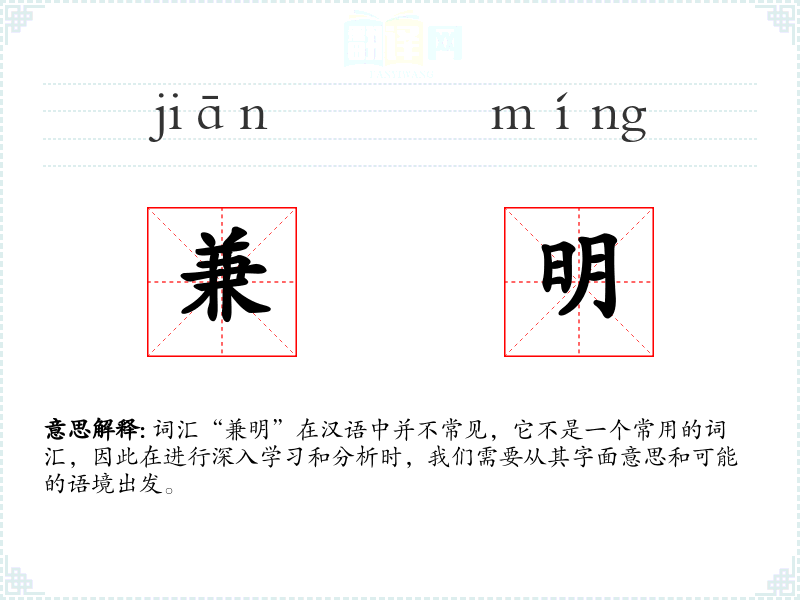 词汇“兼明”在汉语中并不常见,它不是一个常用的词汇,因此在进行深入学习和分析时,我们需要从其字面意思和可能的语境出发。