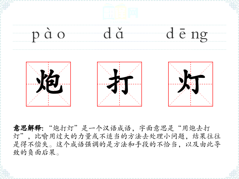 “炮打灯”是一个汉语成语,字面意思是“用炮去打灯”,比喻用过大的力量或不适当的方法去处理小问题,结果往往是得不偿失。这个成语强调的是方法和手段的不恰当,以及由此导致的负面后果。