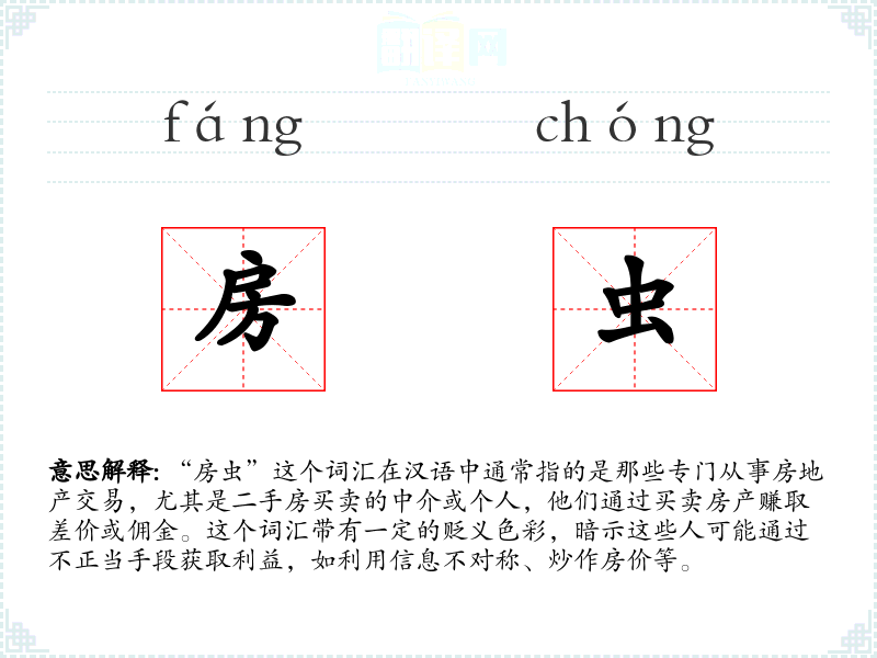 “房虫”这个词汇在汉语中通常指的是那些专门从事房地产交易,尤其是二手房买卖的中介或个人,他们通过买卖房产赚取差价或佣金。这个词汇带有一定的贬义色彩,暗示这些人可能通过不正当手段获取利益,如利用信息不对称、炒作房价等。