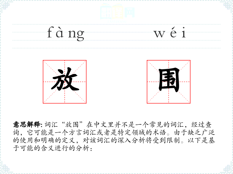 词汇“放围”在中文里并不是一个常见的词汇,经过查询,它可能是一个方言词汇或者是特定领域的术语。由于缺乏广泛的使用和明确的定义,对该词汇的深入分析将受到限制。以下是基于可能的含义进行的分析: