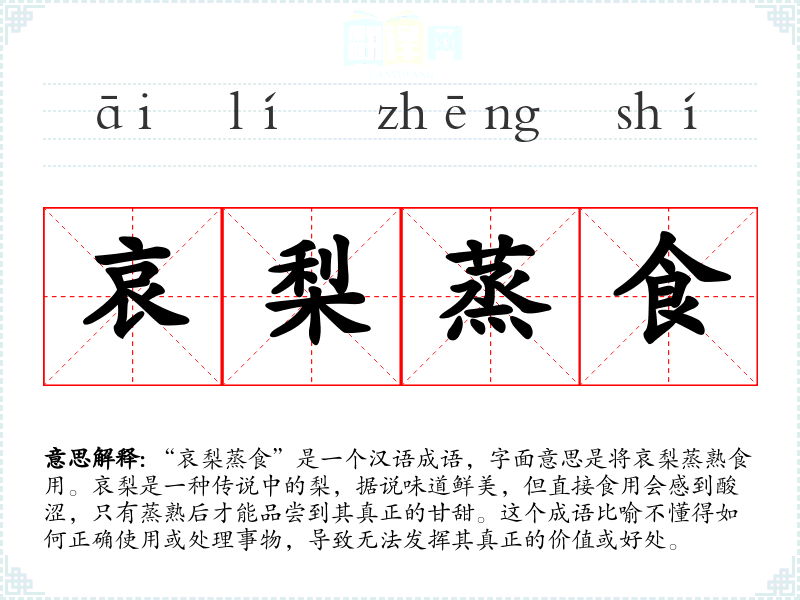 “哀梨蒸食”这个成语出自《左传·宣公十五年》:“哀梨蒸食,不如弃之。”原意是指哀梨如果不蒸熟食用,不如直接丢弃,因为直接食用会感到酸涩。后来这个成语被广泛用来比喻不懂得如何正确使用或处理事物。