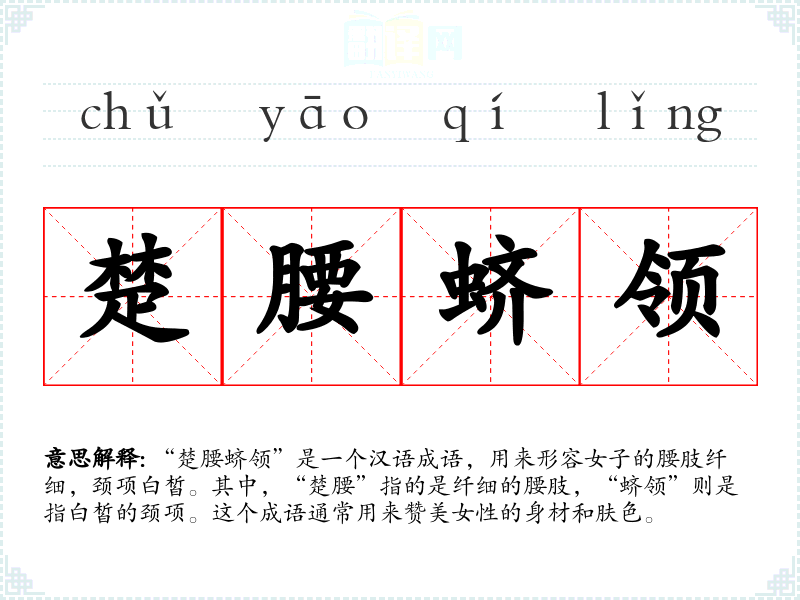 “楚腰蛴领”是一个汉语成语,用来形容女子的腰肢纤细,颈项白皙。其中,“楚腰”指的是纤细的腰肢,“蛴领”则是指白皙的颈项。这个成语通常用来赞美女性的身材和肤色。