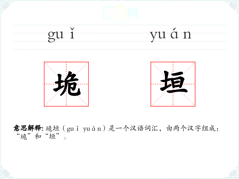垝垣(guǐ yuán)是一个汉语词汇,由两个汉字组成:“垝”和“垣”。