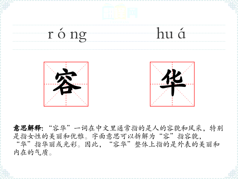 “容华”一词在中文里通常指的是人的容貌和风采,特别是指女性的美丽和优雅。字面意思可以拆解为“容”指容貌,“华”指华丽或光彩。因此,“容华”整体上指的是外表的美丽和内在的气质。