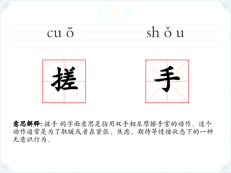 搓手 的字面意思是指用双手相互摩擦手掌的动作。这个动作通常是为了取暖或者在紧张、焦虑、期待等情绪状态下的一种无意识行为。