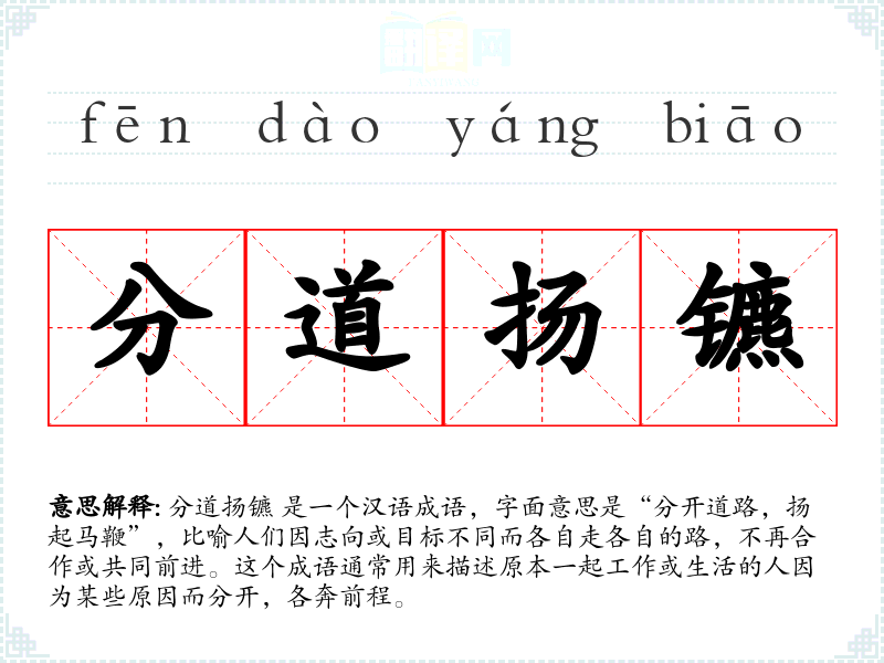 分道扬镳 这个成语最早出现在《左传》中,原意是指马车分开行驶,马鞭扬起。随着时间的推移,这个成语的含义逐渐扩展,用来比喻人们在生活或事业上的分离。