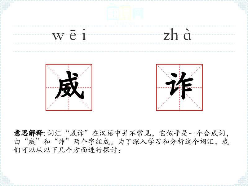 词汇“威诈”在汉语中并不常见,它似乎是一个合成词,由“威”和“诈”两个字组成。为了深入学习和分析这个词汇,我们可以从以下几个方面进行探讨: