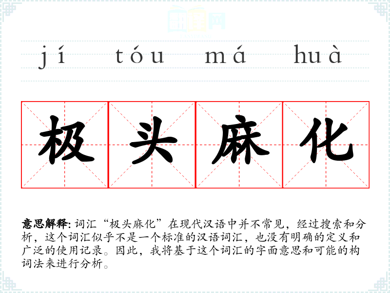 词汇“极头麻化”在现代汉语中并不常见,经过搜索和分析,这个词汇似乎不是一个标准的汉语词汇,也没有明确的定义和广泛的使用记录。因此,我将基于这个词汇的字面意思和可能的构词法来进行分析。