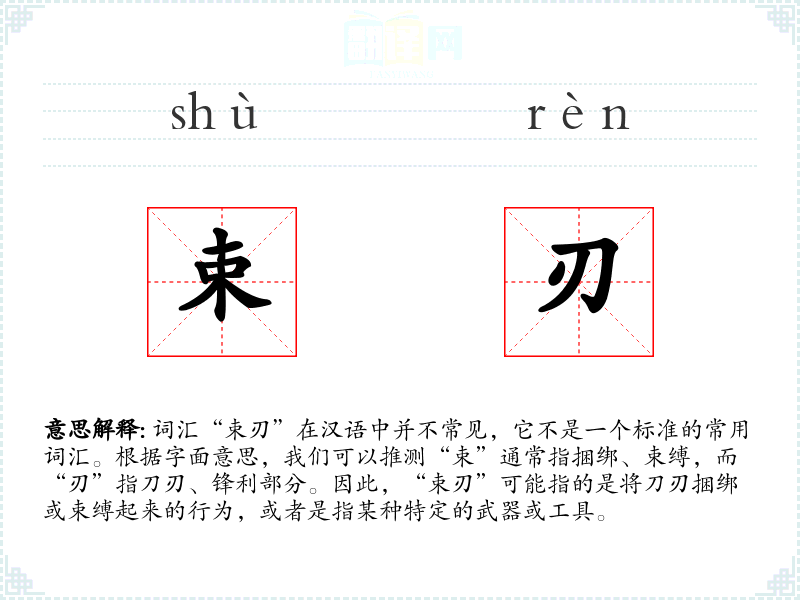 在武术或武器相关的文化中,“束刃”可能被用来描述某种特殊的技巧或武器。在现代社会中,这个词可能不会被广泛使用,除非是在特定的文化或专业领域中。