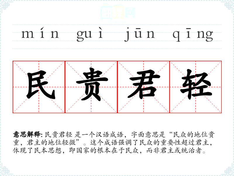 民贵君轻 是一个汉语成语,字面意思是“民众的地位贵重,君主的地位轻微”。这个成语强调了民众的重要性超过君主,体现了民本思想,即国家的根本在于民众,而非君主或统治者。