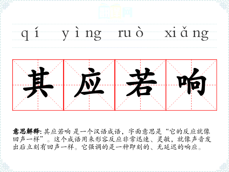 其应若响 是一个汉语成语,字面意思是“它的反应就像回声一样”。这个成语用来形容反应非常迅速、灵敏,就像声音发出后立刻有回声一样。它强调的是一种即刻的、无延迟的响应。