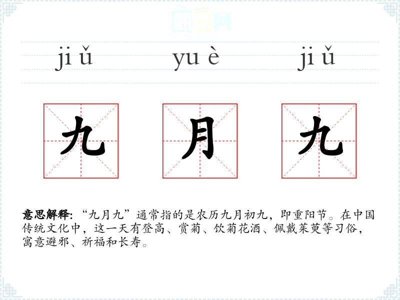 - 文学:在古诗词中,“九月九”常被用来描绘秋天的景色和重阳节的*俗,如王维的《九月九日忆山东兄弟》。