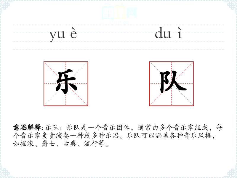 - 口语:在日常对话中,乐队通常指一个音乐团体,人们可能会讨论他们喜欢的乐队或即将举行的乐队演出。