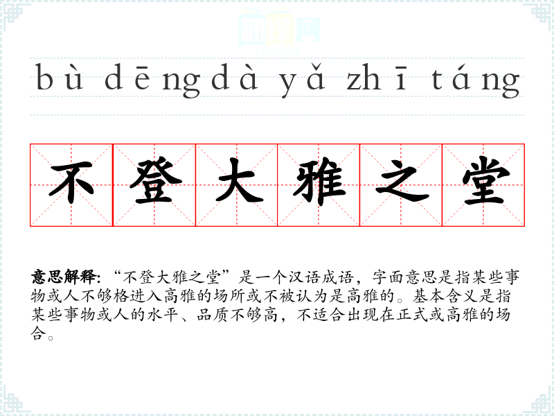 “不登大雅之堂”是一个汉语成语,字面意思是指某些事物或人不够格进入高雅的场所或不被认为是高雅的。基本含义是指某些事物或人的水平、品质不够高,不适合出现在正式或高雅的场合。