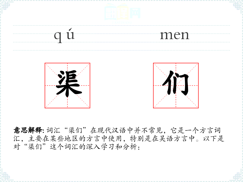 词汇“渠们”在现代汉语中并不常见,它是一个方言词汇,主要在某些地区的方言中使用,特别是在吴语方言中。以下是对“渠们”这个词汇的深入学习和分析: