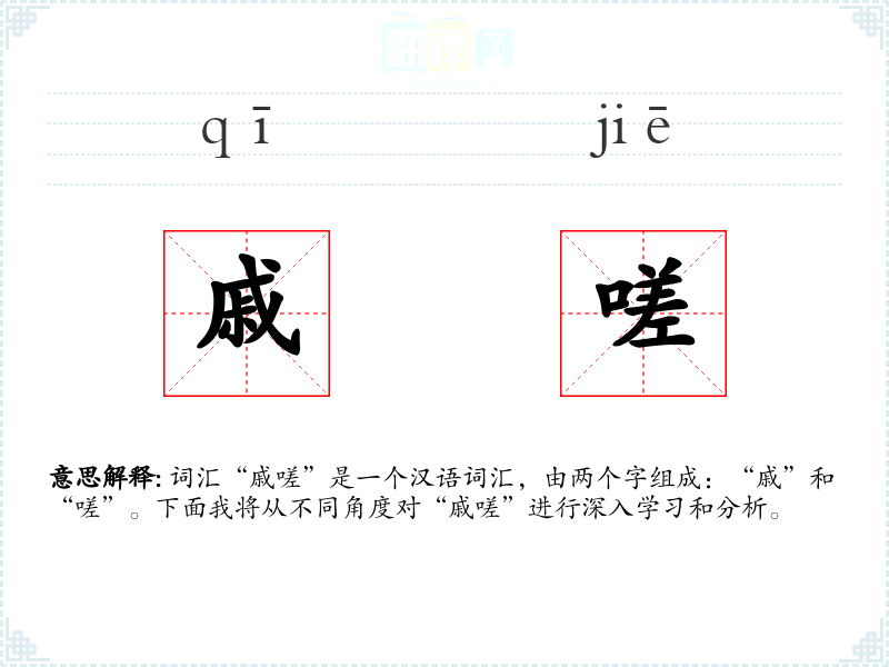 词汇“戚嗟”是一个汉语词汇,由两个字组成:“戚”和“嗟”。下面我将从不同角度对“戚嗟”进行深入学*和分析。