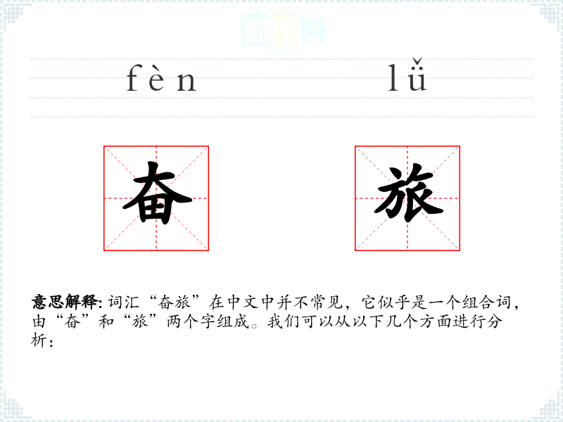 词汇“奋旅”在中文中并不常见,它似乎是一个组合词,由“奋”和“旅”两个字组成。我们可以从以下几个方面进行分析: