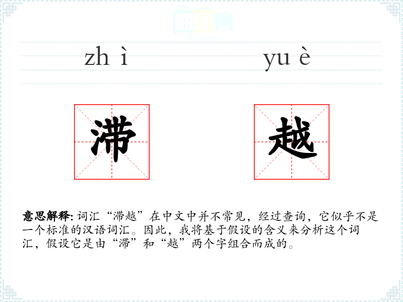 词汇“滞越”在中文中并不常见,经过查询,它似乎不是一个标准的汉语词汇。因此,我将基于假设的含义来分析这个词汇,假设它是由“滞”和“越”两个字组合而成的。