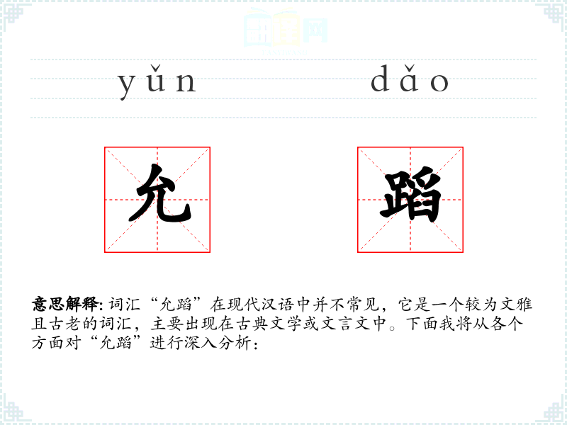 词汇“允蹈”在现代汉语中并不常见,它是一个较为文雅且古老的词汇,主要出现在古典文学或文言文中。下面我将从各个方面对“允蹈”进行深入分析: