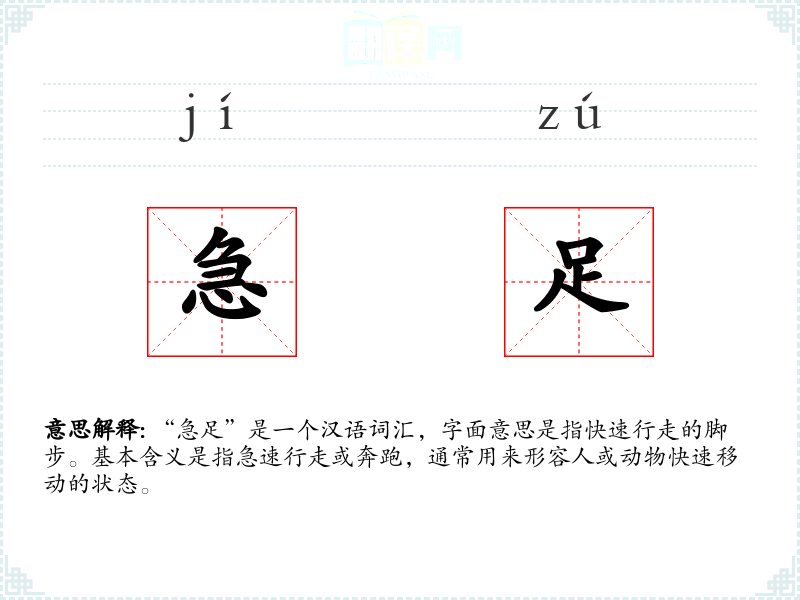 “急足”是一个汉语词汇,字面意思是指快速行走的脚步。基本含义是指急速行走或奔跑,通常用来形容人或动物快速移动的状态。