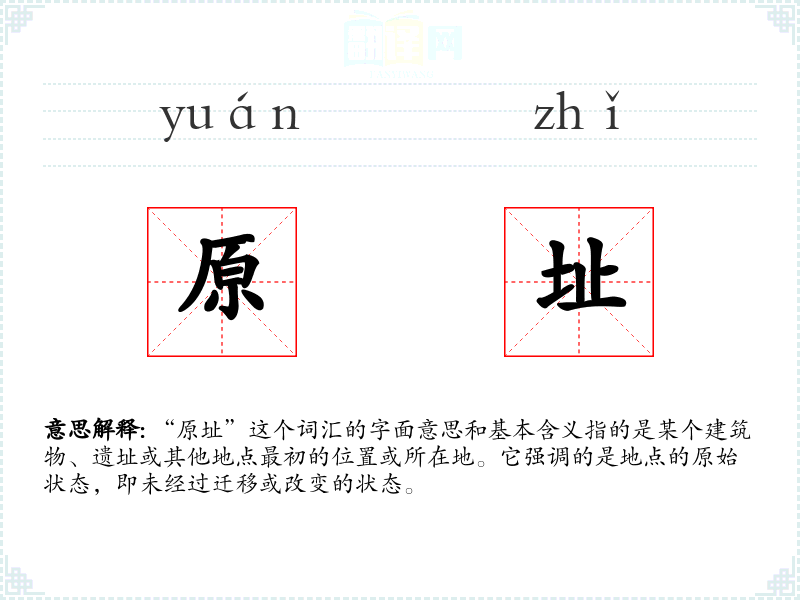 “原址”这个词汇的字面意思和基本含义指的是某个建筑物、遗址或其他地点最初的位置或所在地。它强调的是地点的原始状态,即未经过迁移或改变的状态。