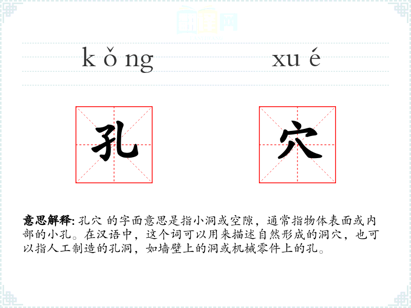 孔穴 的字面意思是指小洞或空隙,通常指物体表面或内部的小孔。在汉语中,这个词可以用来描述自然形成的洞穴,也可以指人工制造的孔洞,如墙壁上的洞或机械零件上的孔。