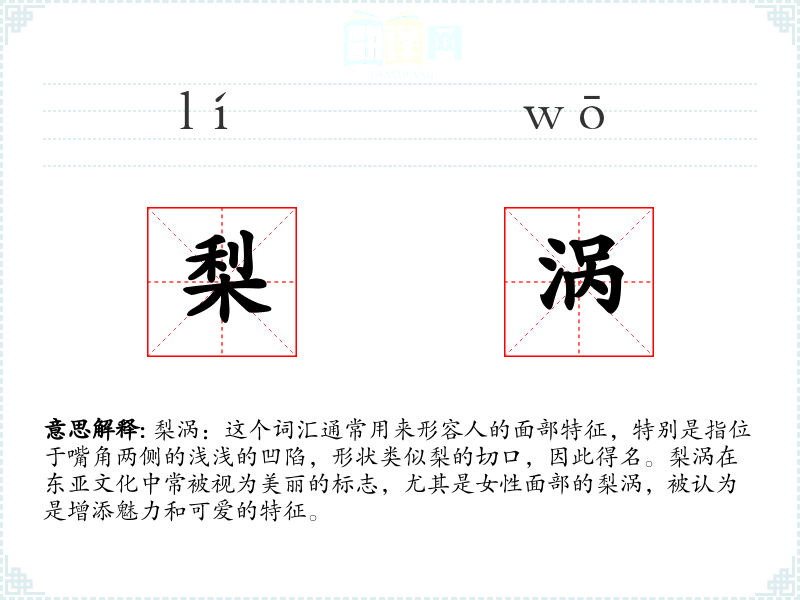 梨涡:这个词汇通常用来形容人的面部特征,特别是指位于嘴角两侧的浅浅的凹陷,形状类似梨的切口,因此得名。梨涡在东亚文化中常被视为美丽的标志,尤其是女性面部的梨涡,被认为是增添魅力和可爱的特征。