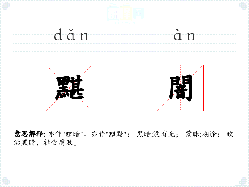 亦作"黮暗"。亦作"黮黯"; 黑暗;没有光; 蒙昧;湖涂; 政治黑暗,社会腐败。