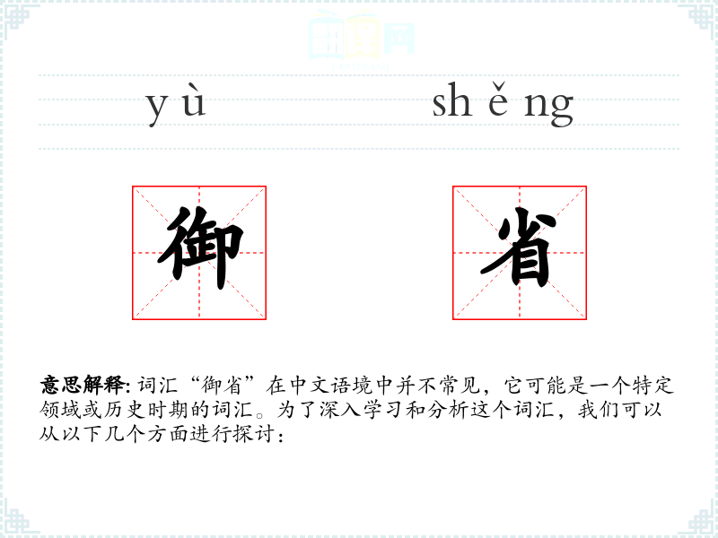 词汇“御省”在中文语境中并不常见,它可能是一个特定领域或历史时期的词汇。为了深入学*和分析这个词汇,我们可以从以下几个方面进行探讨:
