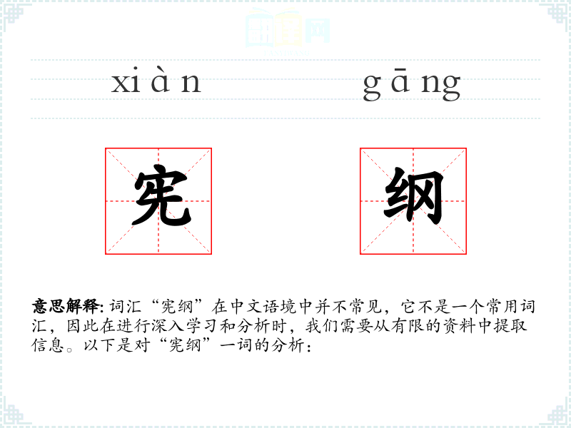 词汇“宪纲”在中文语境中并不常见,它不是一个常用词汇,因此在进行深入学习和分析时,我们需要从有限的资料中提取信息。以下是对“宪纲”一词的分析: