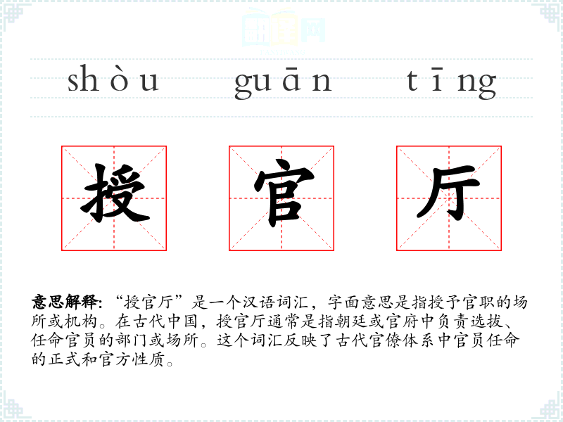 “授官厅”这个词汇源自古代汉语,其中“授”意为授予,“官”指官职,“厅”则是指场所或机构。随着时间的推移,这个词汇的含义和使用场景可能有所变化,但其核心意义——授予官职的正式场所——保持不变。