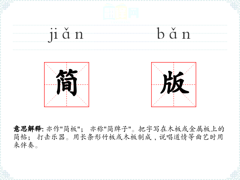 亦作"简板"; 亦称"简牌子"。把字写在木板或金属板上的简帖; 打击乐器。用长条形竹板或木板制成﹐说唱道情等曲艺时用来伴奏。