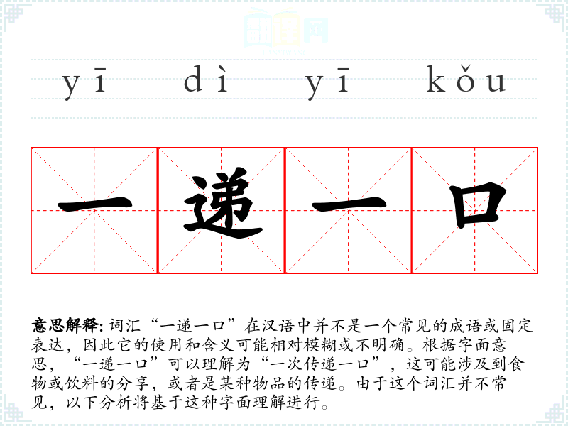 由于“一递一口”不是一个标准的成语或常用词汇,其词源和演变不太明确。它可能是由日常生活中的具体行为逐渐形成的口语表达。