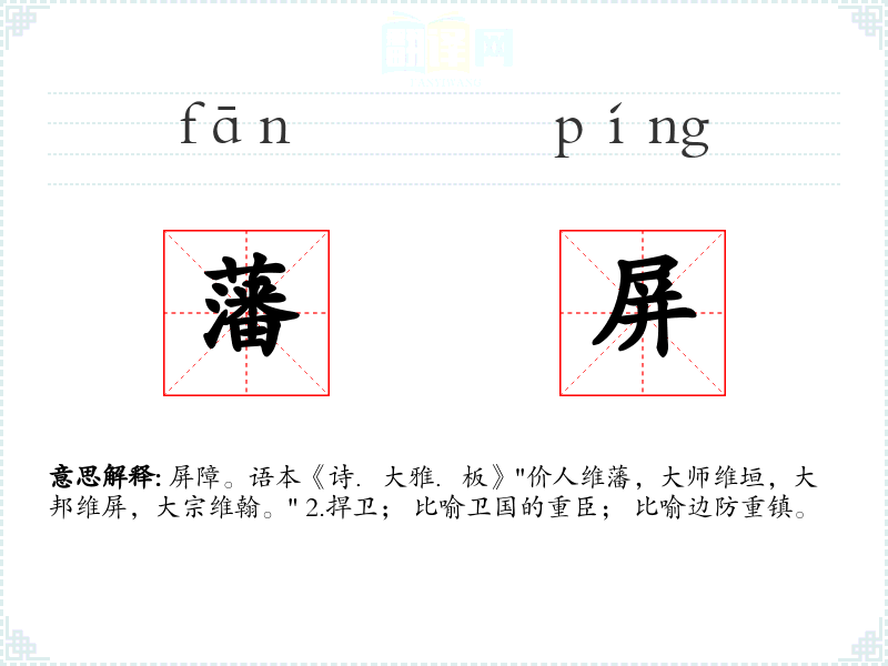 屏障。语本《诗.大雅.板》"价人维藩,大师维垣,大邦维屏,大宗维翰。" 2.捍卫; 比喻卫国的重臣; 比喻边防重镇。