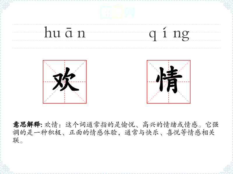 欢情:这个词通常指的是愉悦、高兴的情绪或情感。它强调的是一种积极、正面的情感体验,通常与快乐、喜悦等情感相关联。