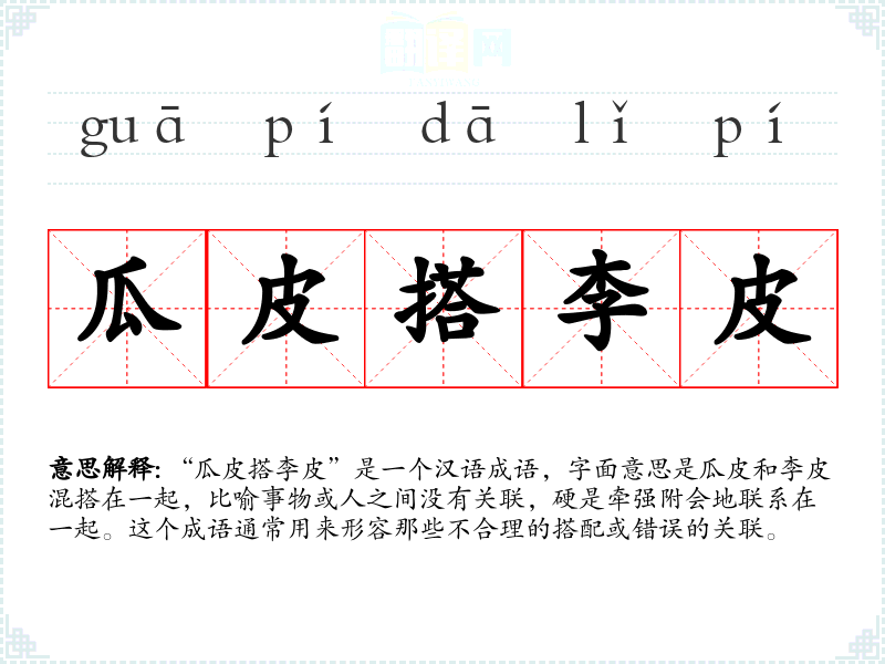 “瓜皮搭李皮”是一个汉语成语,字面意思是瓜皮和李皮混搭在一起,比喻事物或人之间没有关联,硬是牵强附会地联系在一起。这个成语通常用来形容那些不合理的搭配或错误的关联。