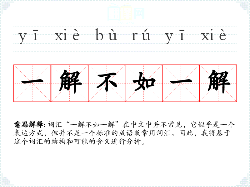 词汇“一解不如一解”在中文中并不常见,它似乎是一个表达方式,但并不是一个标准的成语或常用词汇。因此,我将基于这个词汇的结构和可能的含义进行分析。