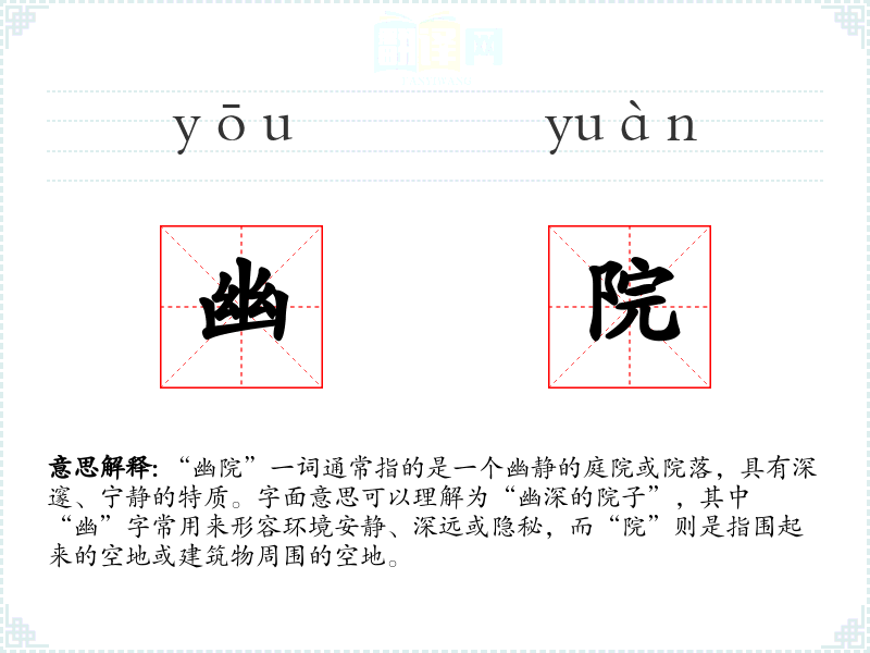 “幽院”一词的词源较为直接,由“幽”和“院”两个字组成,这两个字在古代汉语中已有使用,且含义相对固定。随着时间的推移,这个词在文学和日常语言中的使用逐渐形成了特定的文化内涵。