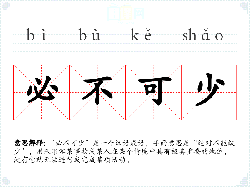 “必不可少”是一个汉语成语,字面意思是“绝对不能缺少”,用来形容某事物或某人在某个情境中具有极其重要的地位,没有它就无法进行或完成某项活动。