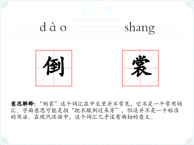 “倒裳”这个词汇在中文里并不常见,它不是一个常用词汇。字面意思可能是指“把衣服倒过来穿”,但这并不是一个标准的用法。在现代汉语中,这个词汇几乎没有确切的意义。