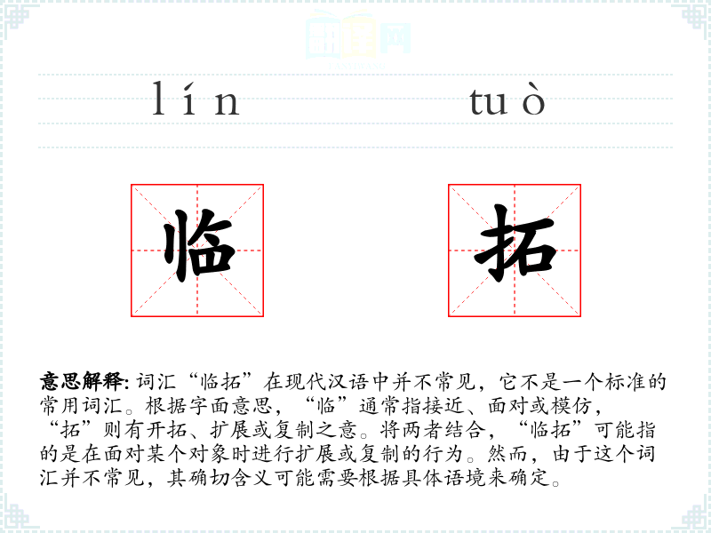 由于“临拓”不是一个常用词汇,它在不同语境下的使用非常有限。可能在一些特定的技术文档、艺术复制或历史研究中出现,用于描述某种复制或扩展的技术。