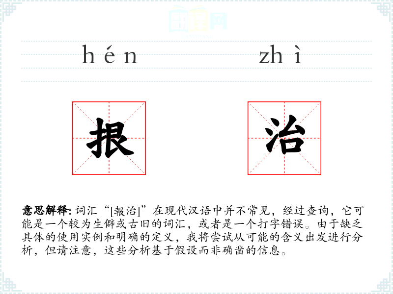 词汇“[報治]”在现代汉语中并不常见,经过查询,它可能是一个较为生僻或古旧的词汇,或者是一个打字错误。由于缺乏具体的使用实例和明确的定义,我将尝试从可能的含义出发进行分析,但请注意,这些分析基于假设而非确凿的信息。