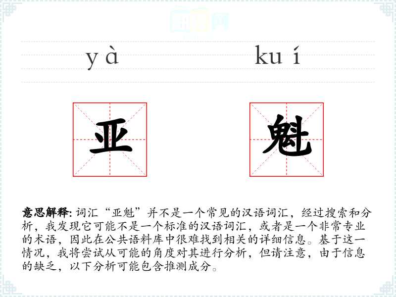 词汇“亚魁”并不是一个常见的汉语词汇,经过搜索和分析,我发现它可能不是一个标准的汉语词汇,或者是一个非常专业的术语,因此在公共语料库中很难找到相关的详细信息。基于这一情况,我将尝试从可能的角度对其进行分析,但请注意,由于信息的缺乏,以下分析可能包含推测成分。