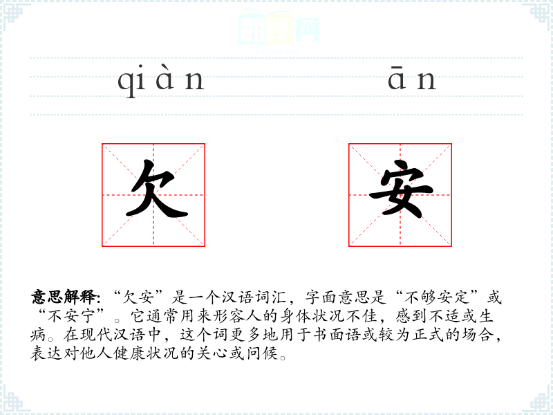 “欠安”是一个汉语词汇,字面意思是“不够安定”或“不安宁”。它通常用来形容人的身体状况不佳,感到不适或生病。在现代汉语中,这个词更多地用于书面语或较为正式的场合,表达对他人健康状况的关心或问候。